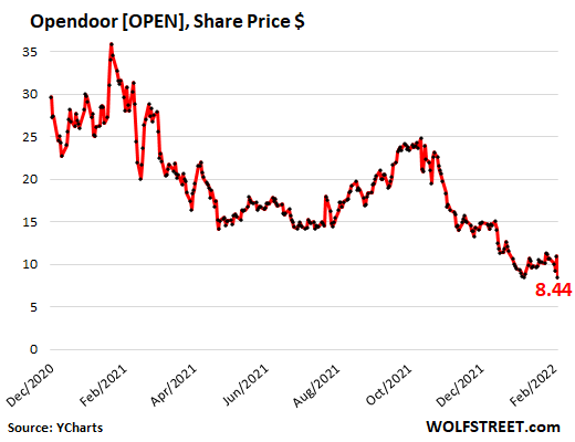 Opendoor zadebiutował w grudniu 2020 r. z ceną IPO 31,47 USD pośród ogromnego pandemonium. Do lutego 2021 r. akcje wyniosą 39 USD. Jeśli „luty 2021” brzmi znajomo, to dlatego, że w tym miesiącu giełda zaczęła spadać pod powierzchnią, gdy wysokie wartości zaczęły spadać jeden po drugim, każdy według własnego harmonogramu. Uszkodzenie było takie Rozpoczęto raportowanie w maju 2021 r.. A to tylko kolejny rozdział, ponieważ jest coraz gorzej. W piątek akcje zamknęły się ceną 8,44 USD, co stanowi spadek o 78% w stosunku do szczytu z lutego 2021 r. i o 73% poniżej ceny IPO (dane za pośrednictwem YWykresy):
